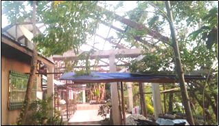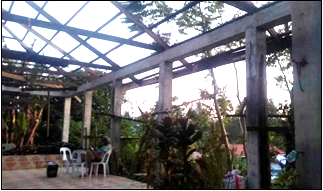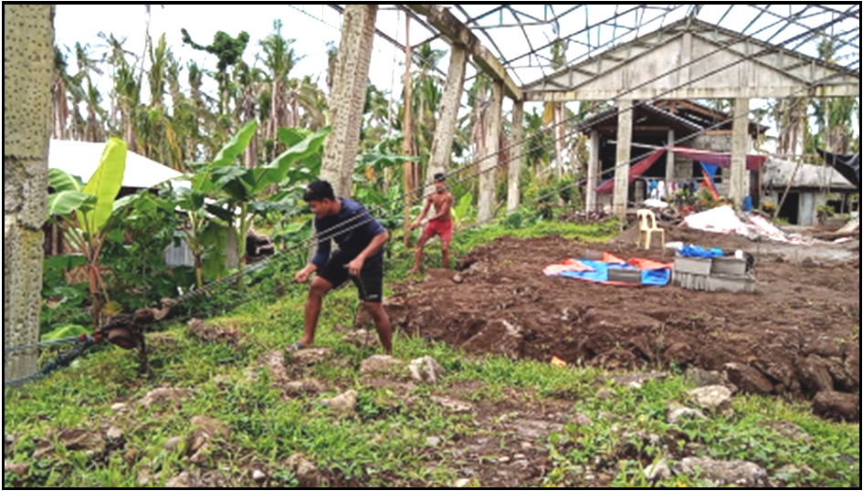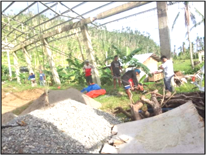 ...das Gebäude auf der Insel Leyte, das bei dem Supertaifun zerstört worden war, wieder zu reparieren. Sogar die Stützpfeiler waren durch den Sturm verschoben worden und müssen neu gerichtet werden.